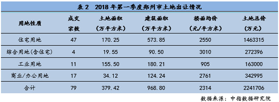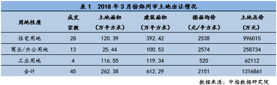 據中指數據研究院發布數據統計,2018年3月份,鄭州市共出讓各類土地45宗(其中住宅用地28宗,工業用地4宗,商業/辦公用地13宗),比上月增加23宗,環比上漲104.55%;成交面積262.38萬平方米,環比上漲221.07%。第一季度成交各類土地79宗(其中住宅用地47宗,工業用地11宗,綜合用地(含住宅)4宗,商業/辦公用地17宗),同比下降27.52%;成交土地面積379.42萬平方米,同比下上漲16.74%。2018年3月份鄭州市土地成交樓面均價2151元/平方米;土地均價5019元/平方米,環比下降16.82%。第一季度鄭州市土地成交樓面均價2314元/平方米;土地均價5908元/平方米,同比下降16.83%。