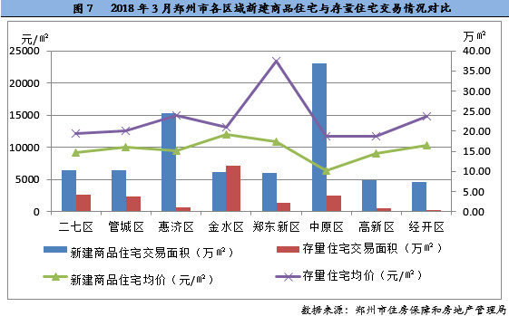 由下統計圖可以看出,2018年3月份,新建住宅成交主要集中在中原區、惠濟區等區域;存量住宅成交主要集中在金水區、二七區、中原區等區域,其中金水區成交面積為11.46萬平方米,其他區域成交量較少。