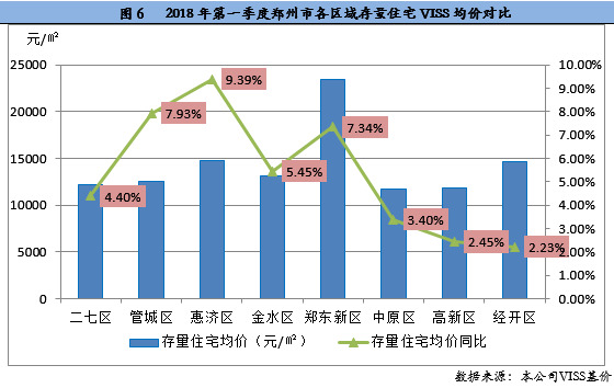 2018年第一季度市八區VISS均價最高的是鄭東新區,監測均價為23419元/平方米,同比上漲7.34%;其次是惠濟區,監測均價為14808元/平方米,同比上漲9.39%;再次是經開區,監測均價為14599元/平方米,同比上漲2.23%;價格最低的是中原區,監測均價為11695元/平方米,環比上漲3.40%。