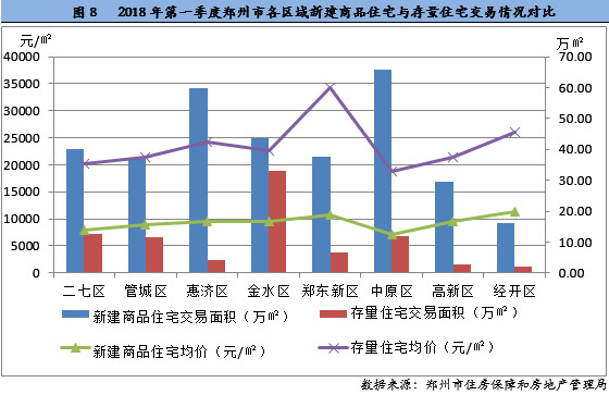由下統計圖可以看出,2018年第一季度,新建住宅成交主要集中在中原區、惠濟區等區域;存量住宅成交主要集中在金水區、二七區、中原區等區域,其中金水區成交面積為33.12萬平方米,其他區域成交量較少。
