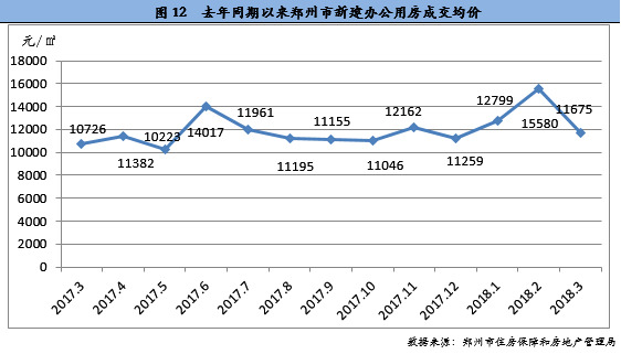 2018年3月份,鄭州市新建辦公用房成交均價為11675元/平方米,環比上月的15580元/平方米下降25.06%,比去年同期的10726元/平方米上漲8.85%。第一季度新建辦公用房季度均價13306元/平方米,同比上漲7.31%。